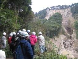 | 深層崩壊源頭部を視察する調査団一行 (鹿児島県南大隅町船石川) |