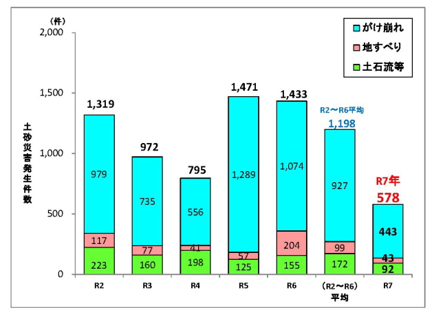 2025(令和7)年は、578件(土石流等92件、地すべり43件、がけ崩れ443件) の土砂災害が発生し、人的被害は、死者・行方不明者2名、負傷者4名であった。 |